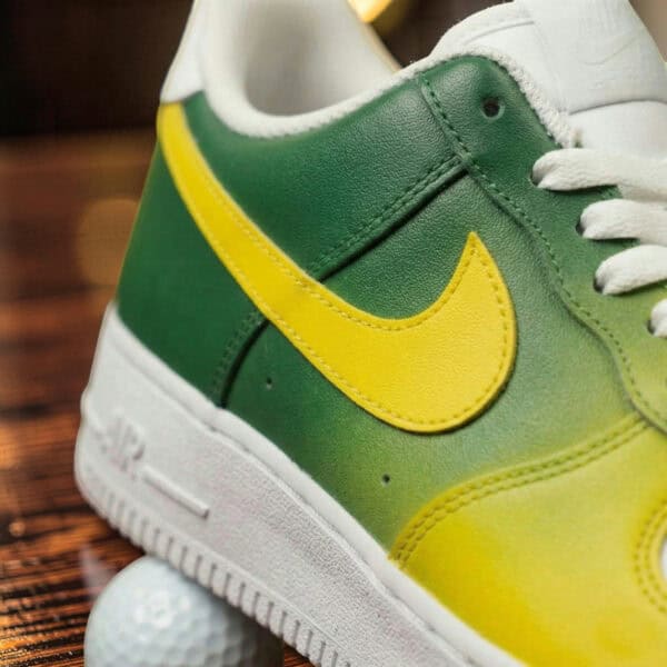 Custom green and yellow faded Air Force 1 sneakers with hand-painted details.