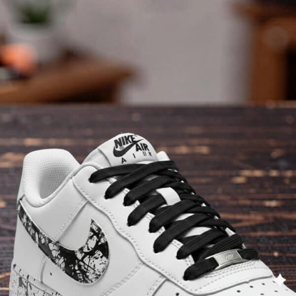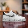 Custom hand-painted black splash design on white Air Force 1 sneakers.