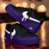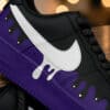 Vivid custom hand-painted purple and black drip Air Force 1 sneakers featuring a bold white Nike swoosh, perfect for sneaker collectors and streetwear.